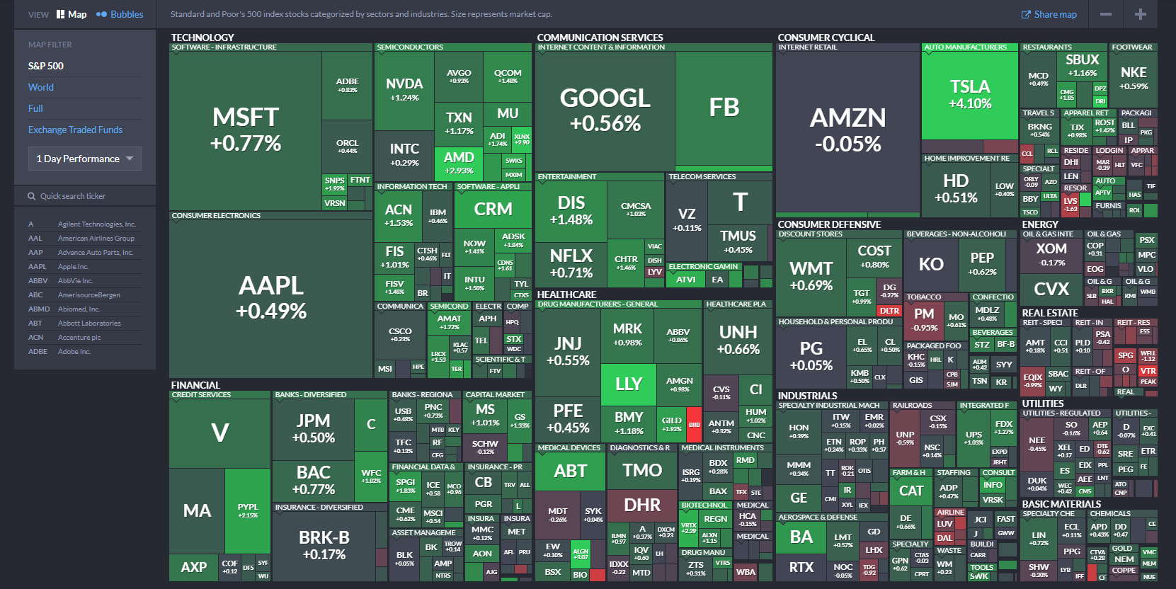 핀비즈 닷컴입니다. 미국주식을 맵으로 한번에 볼 수 있는 사이트입니다. 이 사이트에 가장 큰 특징은 미국의 시장 동향을 한눈에 확인 할 수 있는 것이 특징입니다. 녹색이면 주가가 상승, 빨간색이면 주가가 하락하는 것이며, 색깔이 밝으면 상승폭이나 하락폭이 큰 것입니다. 테슬라(TSLA)를 보시면 엄청 밝은색이죠? 주가가 많이 올라가서 그렇습니다. 전체적으로 장이 좋고 상승의 느낌이 나는걸 알 수 있습니다. 그리고 특정 종목에 마우스 커서를 갖다대면 경쟁사의 주가흐름도 볼 수 있습니다.
