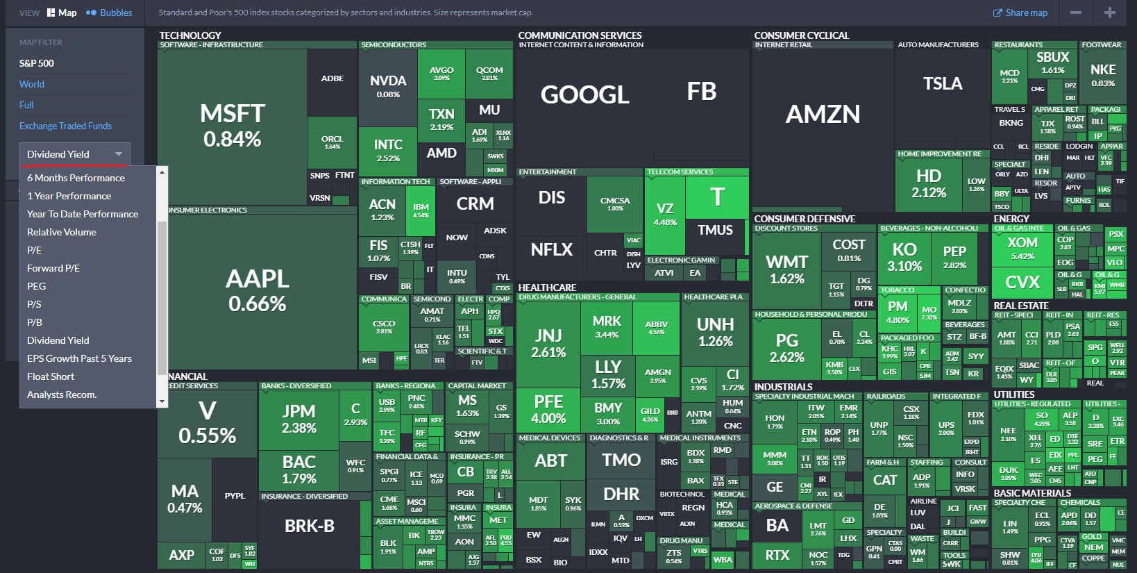좌측에 보면 빨간색 밑줄을 그려놓은 곳을 클릭하면, 주가변동성뿐만아니라, 기간별 수익율, 주가순이익 비율, 연간실적, 배당율등 다양한 정보를 한눈에 쉽게 확인 할 수 있습니다. 위의 사진은 배당율로 클릭한 사진입니다. 우리가 흔히 알고 있는 고배당주 AT&T(T), 셰브론(CVX), 엑슨 모빌(XOM) 등의 색깔이 밝은 녹색이고, 아마존, 테슬라, 구글 등은 배당금을 지급하지 않아서 색깔이 없습니다. 영어를 잘모르는 영알못도 손쉽게 사용가능한 점도 큰 장점 인것 같습니다.