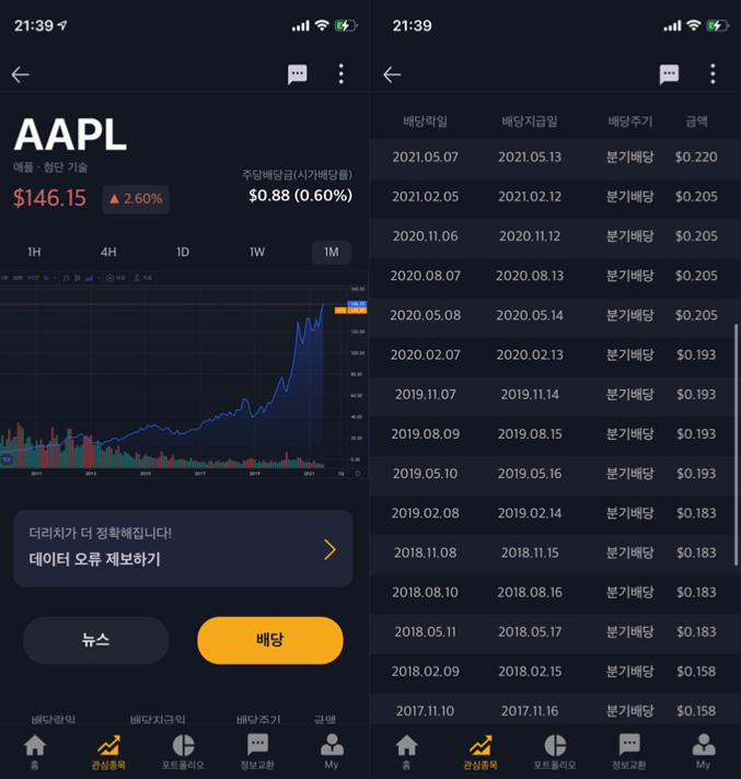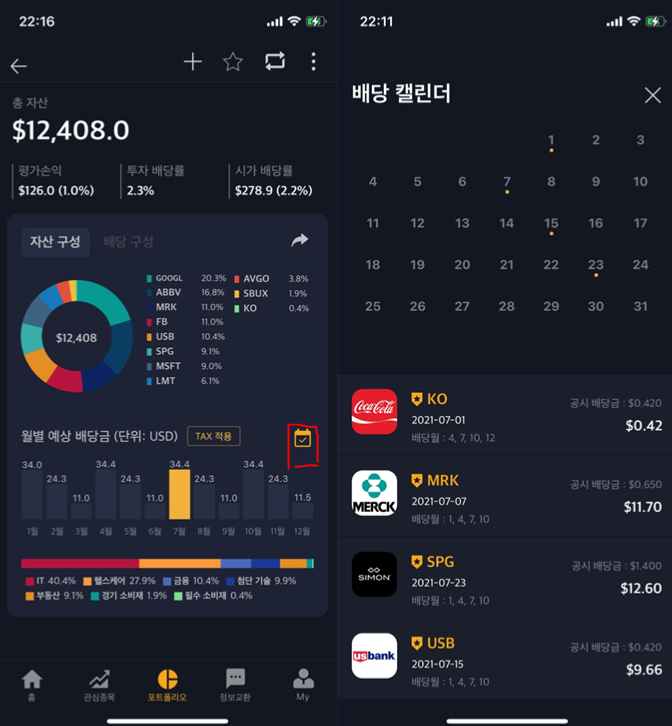 주식을 하고 있는 분들은 이미 많이들 알고 계시는 어플이고, 미국 배당투자를 하시는 분들께는 특히 유용하고 필수로 쓰시면 좋을 것 같습니다!