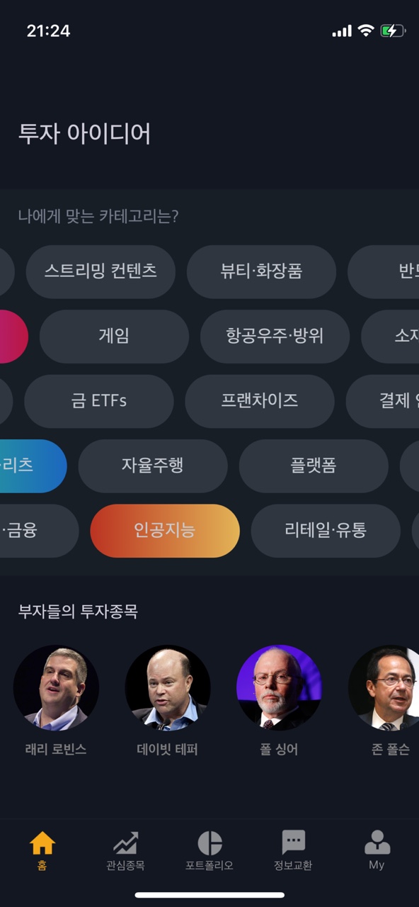 홈 맨 아래로 내리게 되면 투자 아이디어라고 각종 투자 카테고리 섹터에 따라서 주식을 볼 수도 있습니다. 다만 미국 주식들만 나와서 국내 주식을 하는 분들에게는 큰 도움이 안 될 수도 있습니다. 그리고 해외 유명 투자자들의 포트폴리오도 볼 수 있습니다. 많은 사람들이 있는 것은 아니지만, 워런 버핏, 레이달리오, 마이클 버리 등의 포트폴리오를 참고하실 수 있습니다. 주의점은 늘 우리가 접하는 워런버핏, 빌 게이츠의 포트폴리오는 현재가 아닌 이전 분기 과거의 포트폴리오라는 점을 주의하세요!