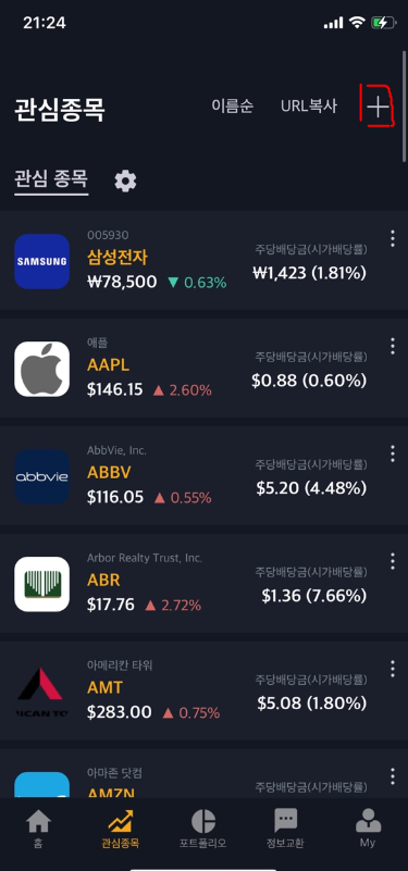 관심종목도 설정해서 볼 수가 있는데, 오른쪽 상단의 플러스 표시를 눌러서 종목을 추가하시면 됩니다.