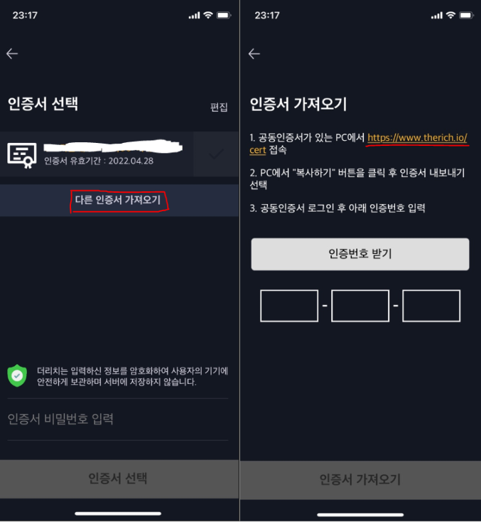 다른 인증서 가져오기를 누르면, 인증서 가져오기가 나오고 PC로 링크를 접속하게끔 되어있습니다.