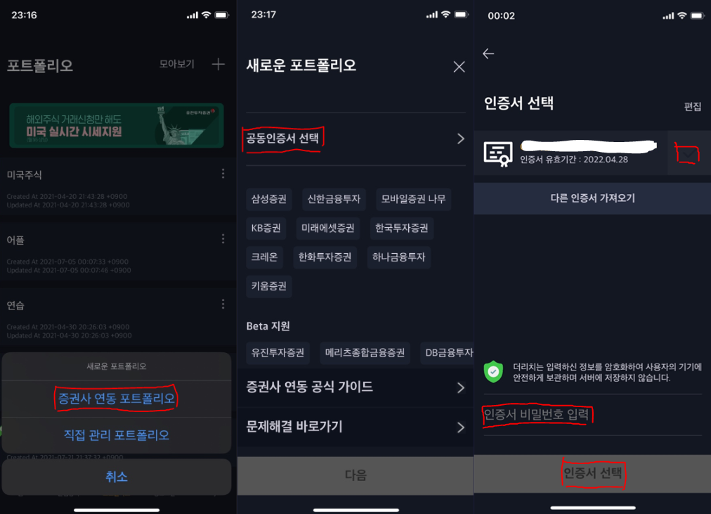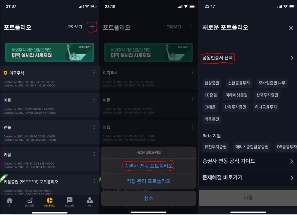 더 리치 어플에서 포트폴리오에서 우측상단의 십자가 모양을 누르면 포트폴리오 만들기가 있습니다. 여기서 증권사 연동 포트폴리오를 만들면 공동인증서를 연결하여 증권사 연동 포트폴리오를 만들 수 있습니다.