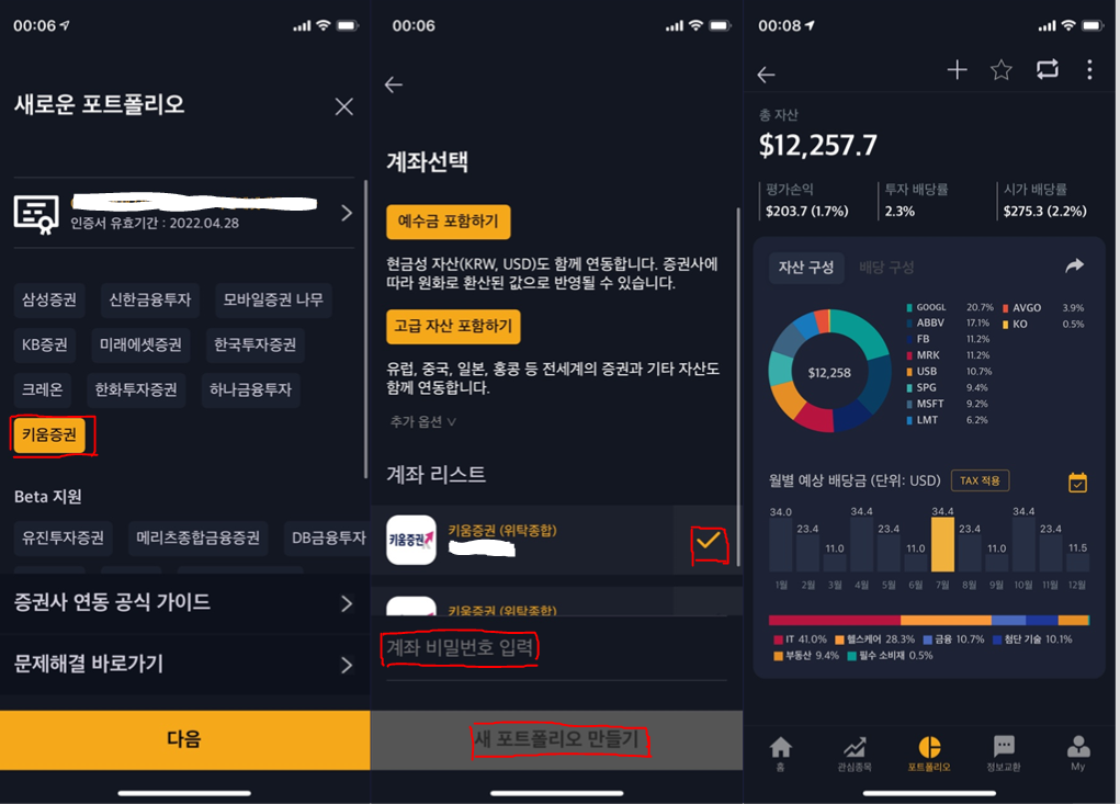 선택하면 계좌를 선택해야하는데, 계좌를 선택하시고 계좌 비밀번호를 입력하고 새 포트폴리오를 만들기를 누르면 맨 오른쪽 처럼 포트폴리오가 만들어진 것입니다.