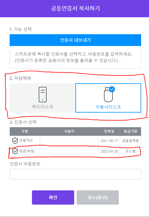 PC에서 확인을 누르신뒤 공동 인증서의 암호를 한번 더 입력해주면 공동 인증서 가져오기가 완료가 됩니다.