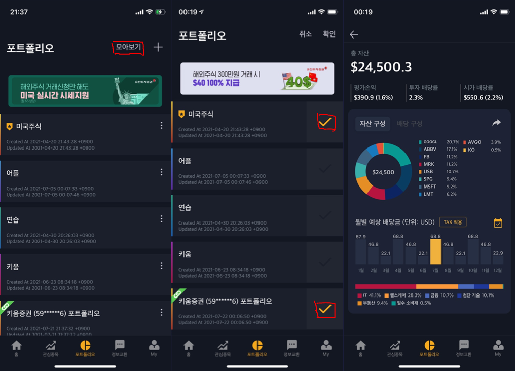 포트폴리오는 계좌별로 여러 개 생성 할 수 있습니다. 포트폴리오를 여러개 만드셔도 포트폴리오 탭에서 모아보기를 선택해서, 원하는 포트폴리오 끼리 묶어서 한번에 보는 것도 가능합니다.