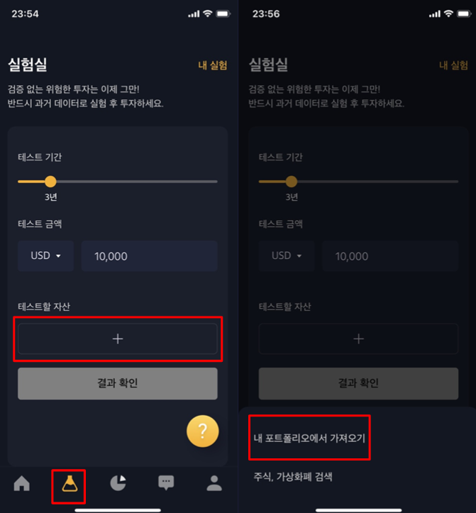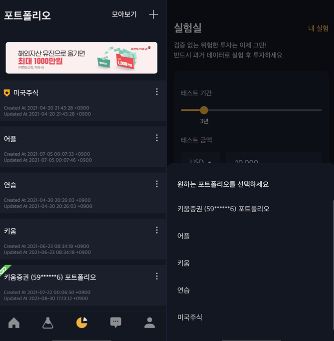 기간 및 금액을 설정할 수 있고, 포트폴리오 가져오기 및 주식, 가상화폐를 검색해서 비교해볼 수 도 있습니다.
