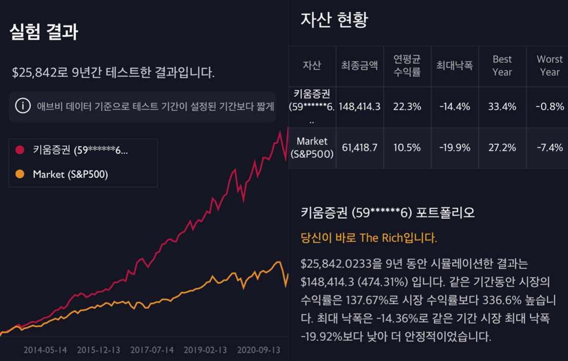 최종금액, 연평균 수익률, 최대 낙폭, 최고의 해, 최악의 해 등의 정보를 알 수 있습니다.!